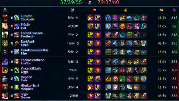 Ranked 181戦目 Solo:Cho’Gath – 5k 3d 19a 13.4kGold 215CS – 負け