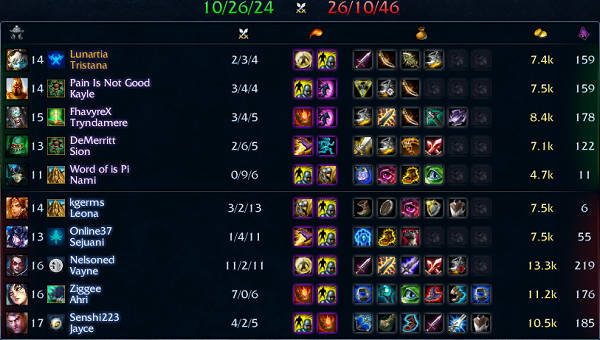 Ranked 723戦目 Solo:Tristana – 2k 3d 4a 7.4kGold 159CS – 負け